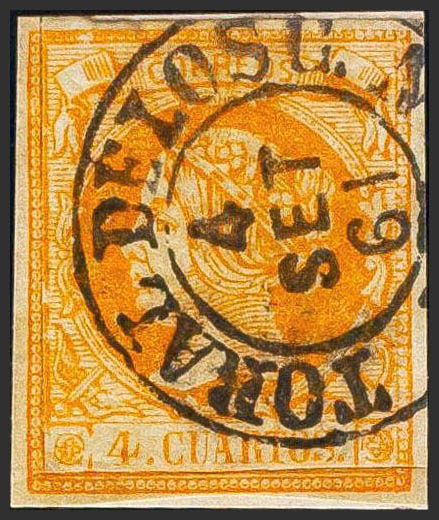 52. 1860. 4 cuartos amarillo. Matasello TORAL DE LOS G. / LEON (Tipo I). MAGNIFICO Y RARO.