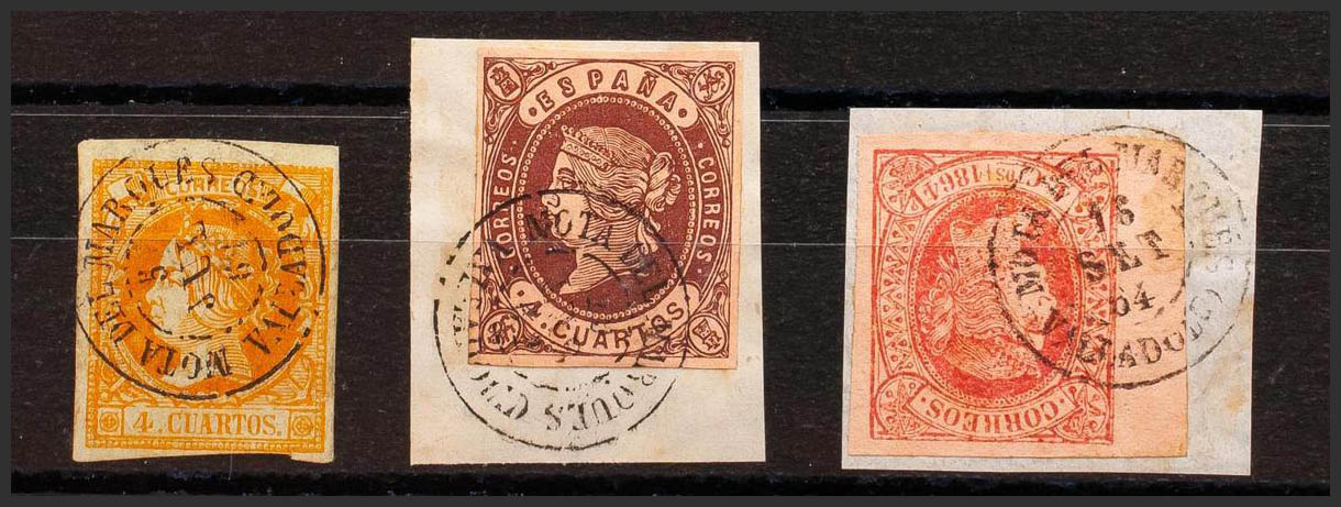 52, 58, 64. (1860ca). Conjunto de tres sellos del 4 cuartos amarillo, castaño y rosa, inutilizados con el matasello MOTA DEL MARQUES / VALLADOLID. MAGNIFICO.
