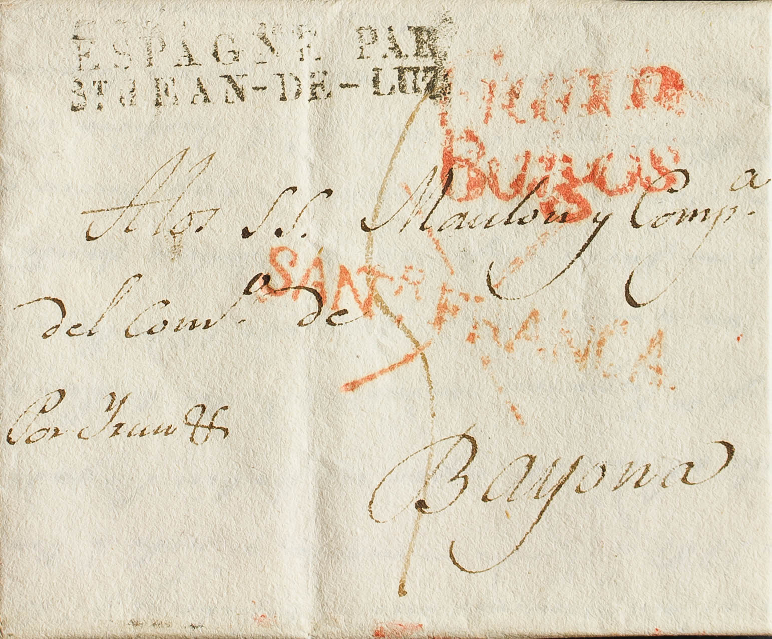 1830. SANTANDER a BAYONA (FRANCIA). Marca SANR. FRANCA (P.E.16) edición 2004 y FRANCA / BURGOS, en rojo y en tránsito (P.E.18) edición 2004. MAGNIFICA Y RARA.