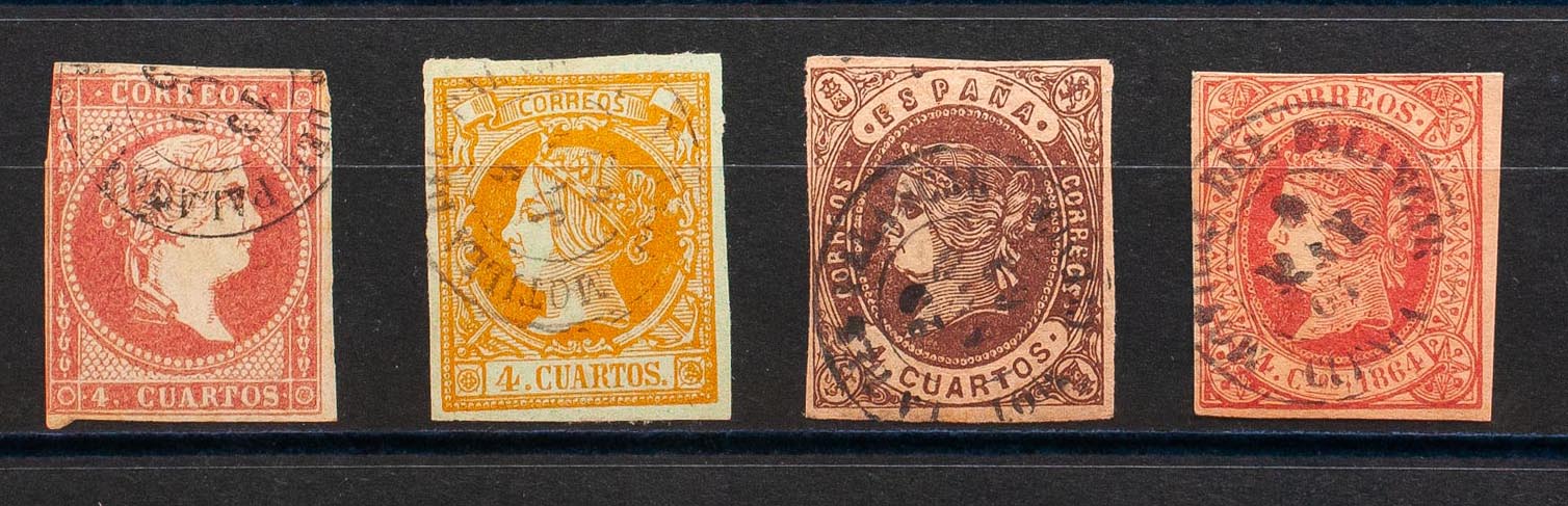48, 52, 58, 64. (1855ca). Conjunto de cuatro sellos del 4 cuartos rojo, amarillo, castaño y rosa, inutilizados con matasello MOTILLA DEL PALANCAR / CUENCA. MAGNIFICO.