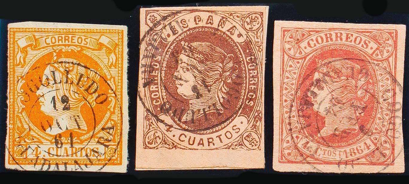 52, 58, 64. (1860ca). Conjunto de tres sellos del 4 cuartos amarillo, castaño y rosa, inutilizados con matasello COGOLLUDO / GUADALAJARA. MAGNIFICO.