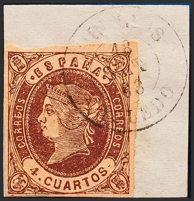 △ 58. 1862. 4 cuartos rojo, sobre fragmento. Matasello TORRIJOS / TOLEDO. BONITO Y RARO.
