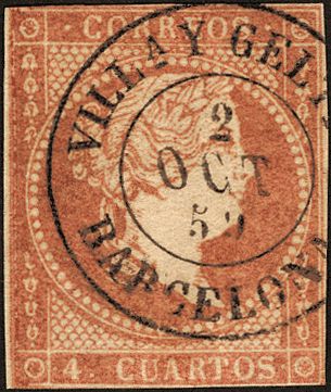 48. 1856. 4 cuartos rojo. Matasello VILLANUEVA Y GELTRU / BARCELONA. MAGNIFICO.