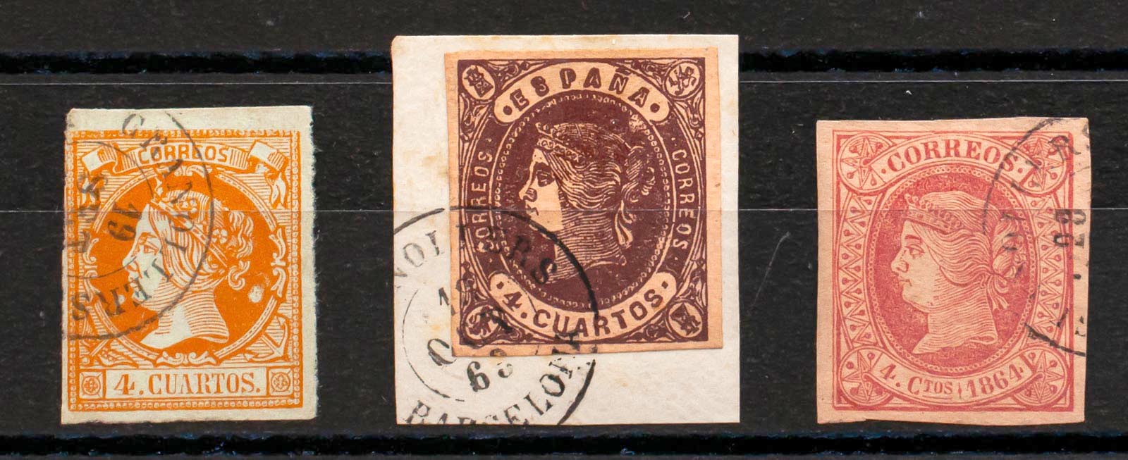 52, 58, 64. (1860ca). Conjunto de tres sellos del 4 cuartos amarillo, castaño y rosa, inutilizados con matasello GRANOLLERS / BARCELONA. MAGNIFICO.