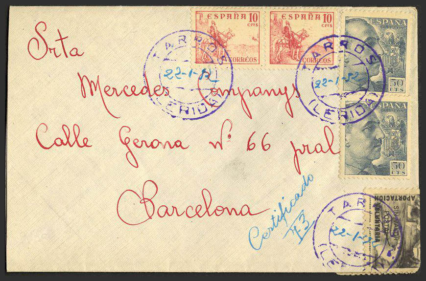 Cataluña. Historia Postal. TARROS / LERIDA, en azul. MAGNIFICA.