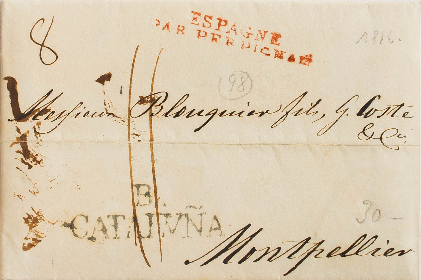 1816. BARCELONA a MONTPELLIER (FRANCIA). Marca B. / CATALUÑA, en negro (P.E.46) edición 2004. MAGNIFICA.