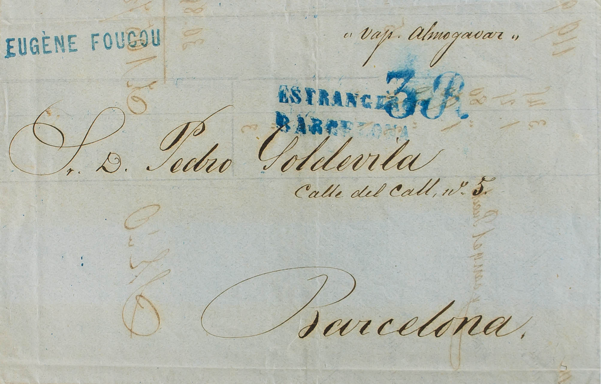 1857. MARSELLA (FRANCIA) a BARCELONA. Marca ESTRANGERO / BARCELONA, en azul (P.E.91) edición 2004. MAGNIFICA.