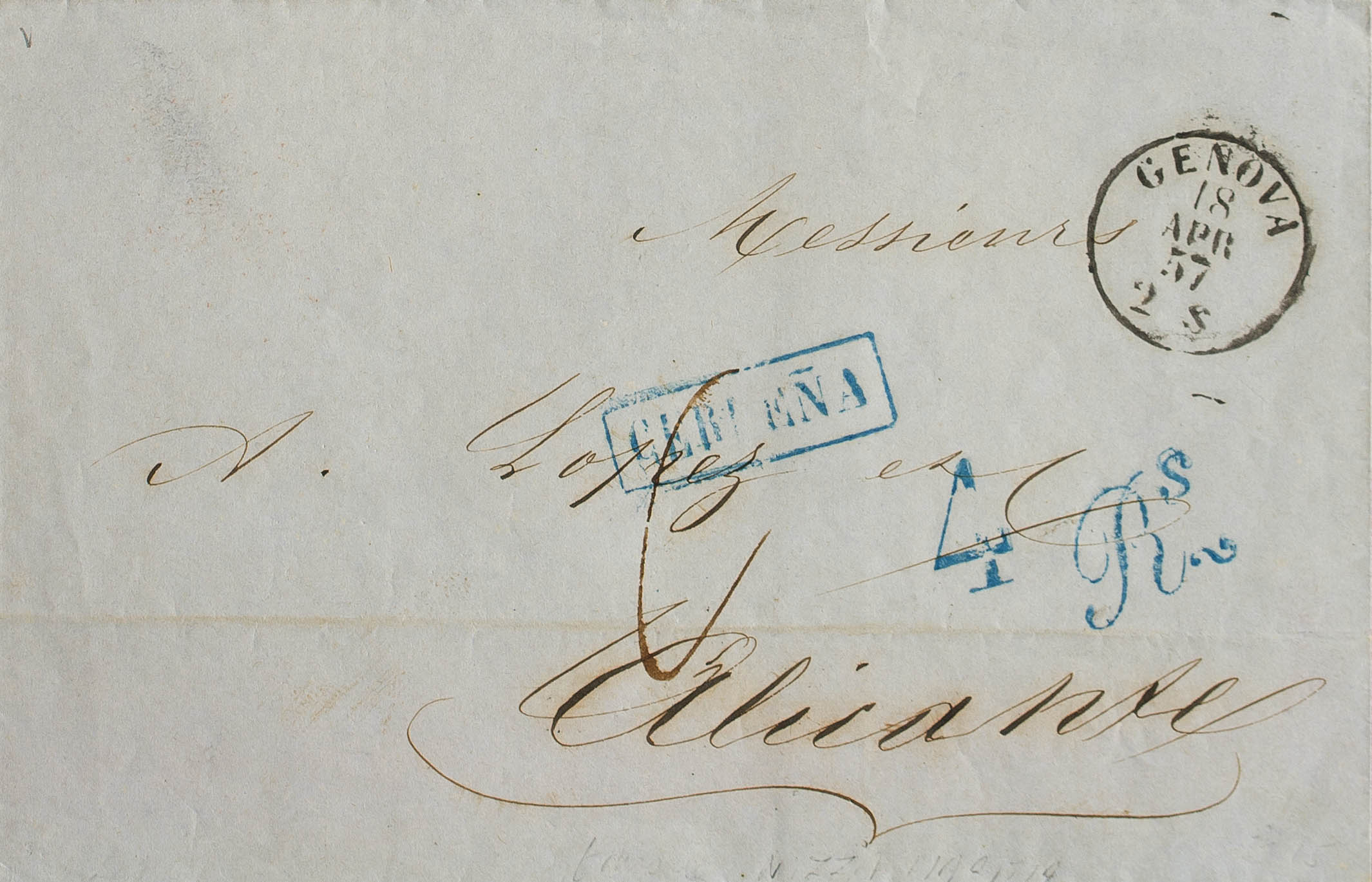 1857. GENOVA a ALICANTE. Marca CERDEÑA, en azul de La Junquera, aplicada para indicar el origen (P.E.8) edición 2004. MAGNIFICA.