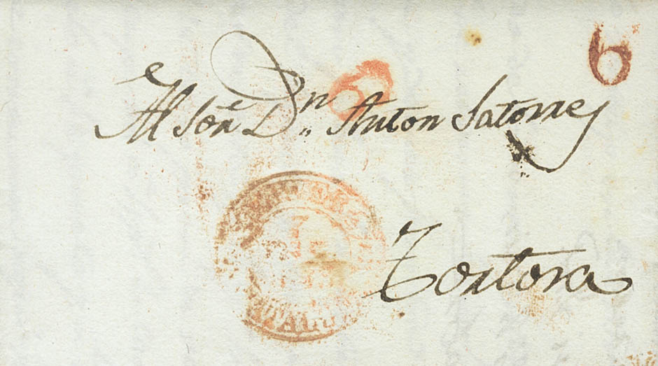 1843. BARCELONA a TORTOSA. Al dorso marca de tránsito CIRCULO CON ASPAS, en rojo de Barcelona (P.E.77) edición 2004. MAGNIFICA.