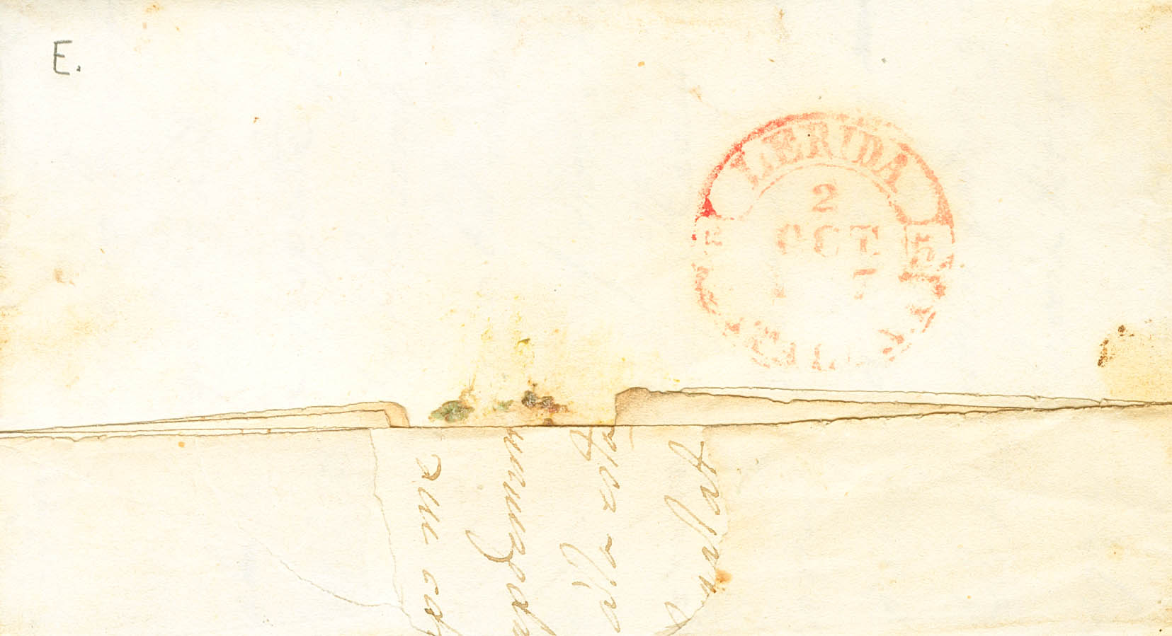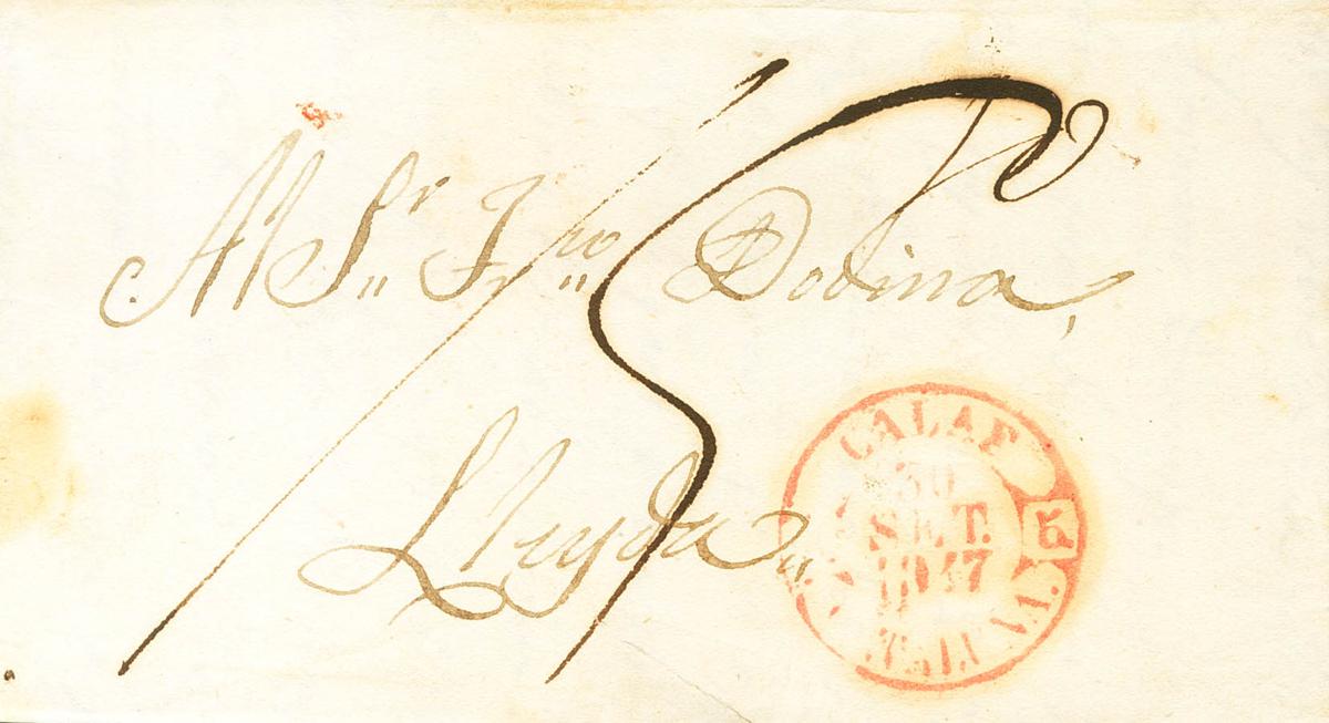 1847. CALAF (TARRAGONA) a LERIDA. Baeza CALAF / CATALUÑA, en rojo. MAGNIFICA.