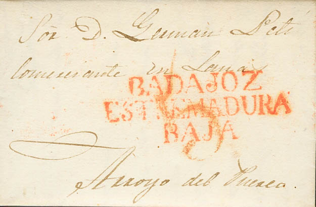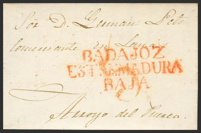 Extremadura. Prefilatelia. BADAJOZ a ARROYO DEL PUERCO. Marca BADAJOZ / ESTREMADURA / BAJA. MAGNIFICA.