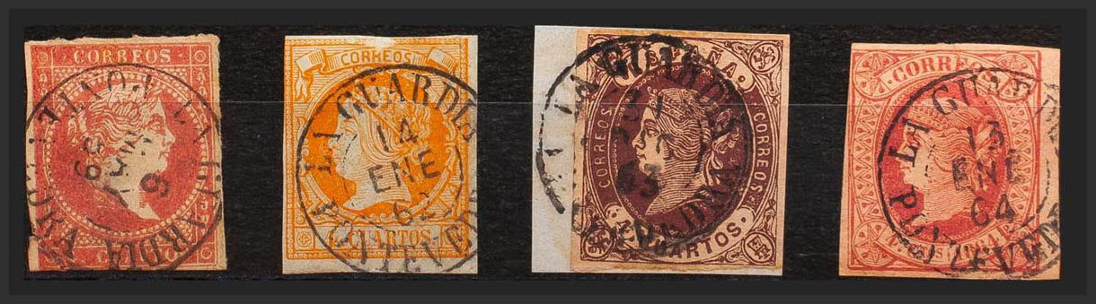 48, 52, 58, 64. (1855ca). Conjunto de cuatro sellos del 4 cuartos rojo, amarillo, castaño y rosa, inutilizados con matasello LA GUARDIA / PONTEVEDRA (Tipo I). MAGNIFICO.