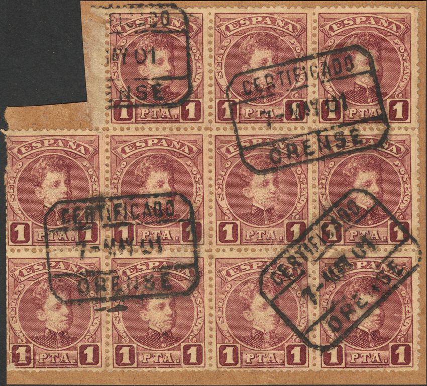 Galicia. Filatelia. CERTIFICADO / ORENSE, bloque de once. MAGNIFICO.