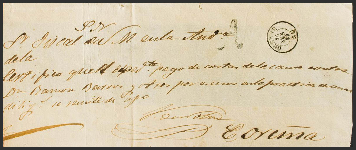 1859. Frente de Plica Judicial de ORENSE a LA CORUÑA. Marca "A", en negro de abono (P.E.20) edición 2004. MAGNIFICA.