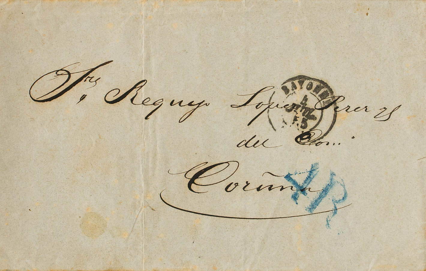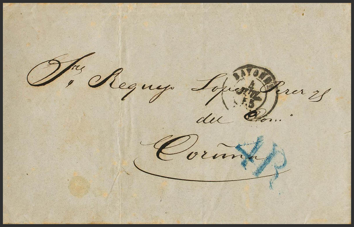 1855. BAYONA (FRANCIA) a LA CORUÑA. Porteo "4 R" (reales), en azul y al dorso marca "A", en rojo de abono (muy tenue) aplicada a la llegada (P.E.25) edición 2004. MAGNIFICA.