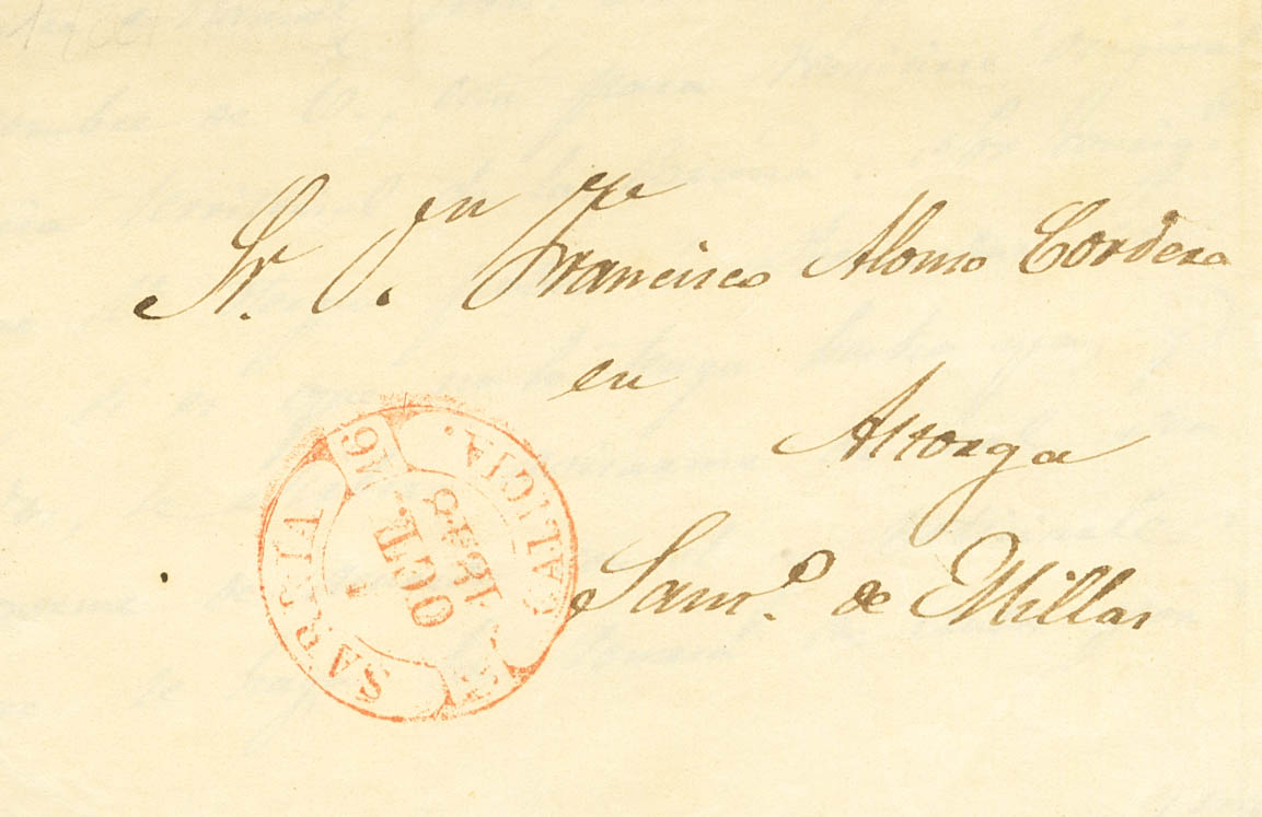 1848. SARRIA (LUGO) a SANTIAGO MILLAS (LEON). Baeza SARRIA / GALICIA, en rojo. MAGNIFICA Y RARA.