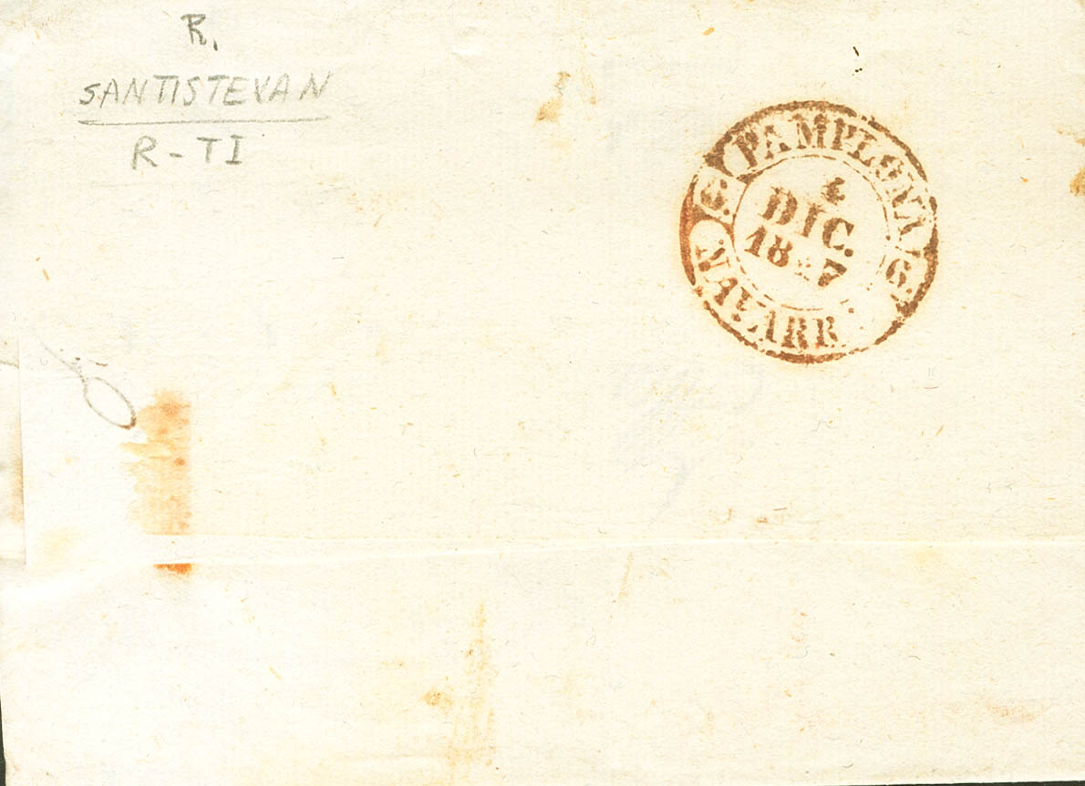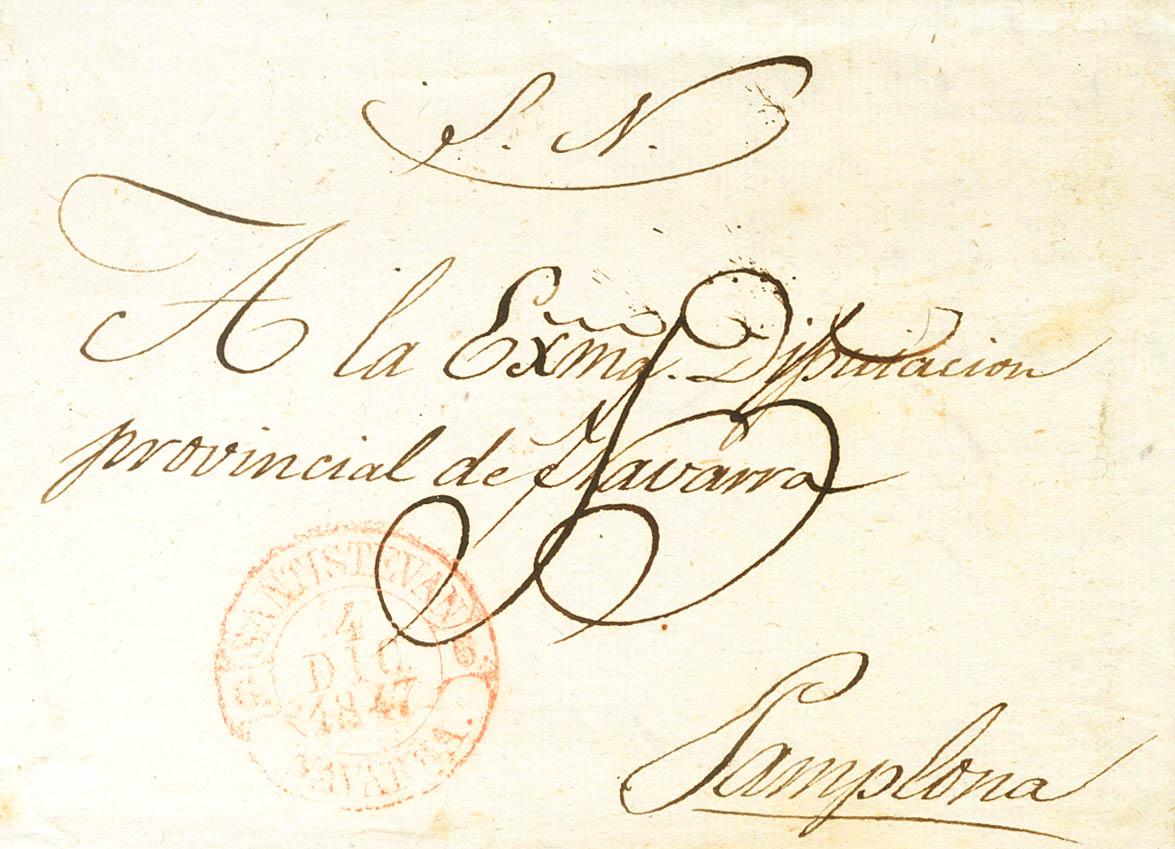 1847. OIZ (NAVARRA) a PAMPLONA. Baeza SANTISTEVAN / NAVARRA, en rojo. MAGNIFICA Y RARA.