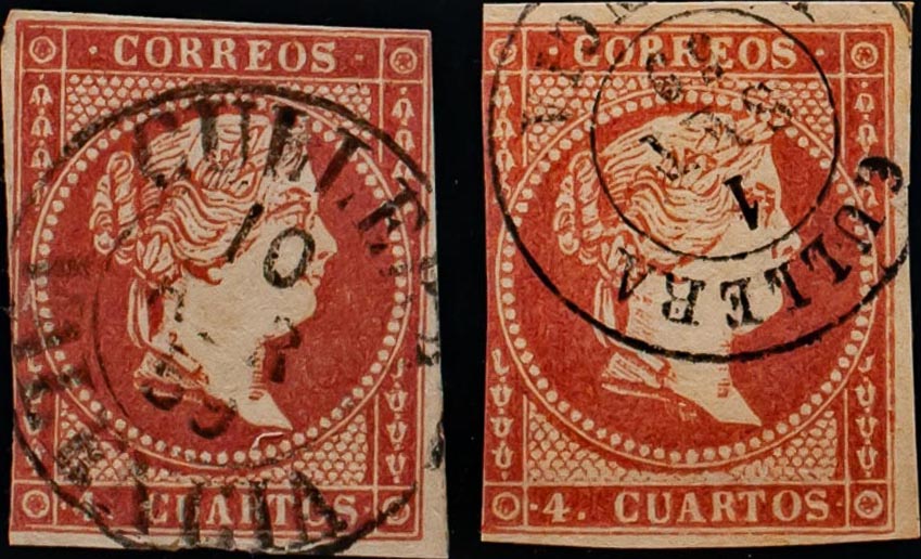 48(2). 1856. Conjunto de dos sellos del 4 cuartos rojo inutilizados con el matasello CULLERA / VALENCIA (Tipo I y II, respectivamente). MAGNIFICOS.