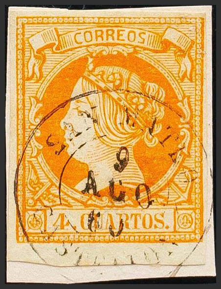 52. 1860. 4 cuartos amarillo. Matasello SAN MATEO / CASTELLON. MAGNIFICO Y RARO.