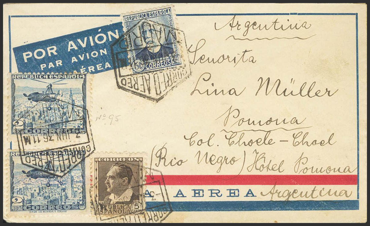 689(2), 681, 738. 1936. 2 pts azul, dos sellos, 5 cts castaño y 50 cts azul. MADRID a COLONIA CHOELE CHOEL (ARGENTINA). Al dorso tránsito por Sevilla y llegada. MAGNIFICA Y RARA.
