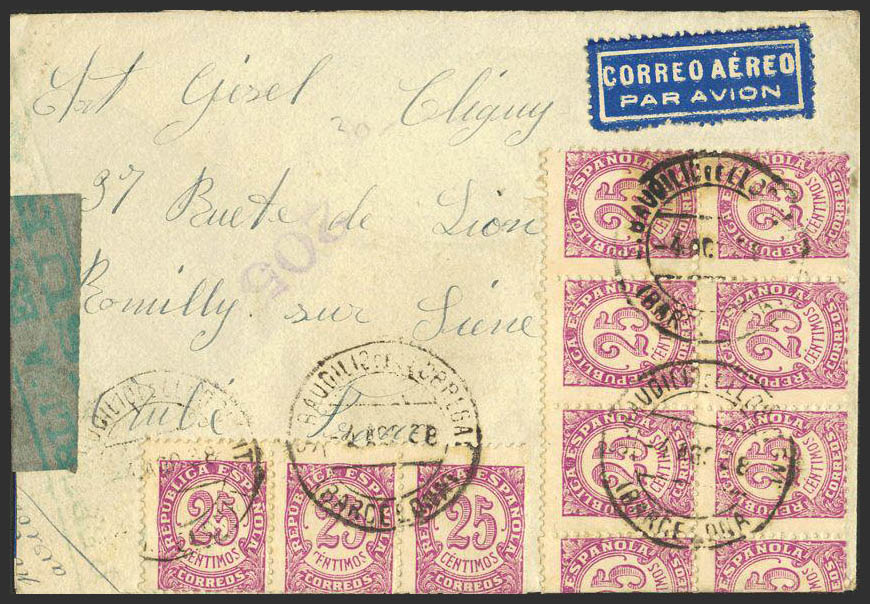 República Española Correo Aéreo. Espectacular franqueo. MAGNIFICA.