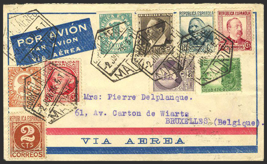 República Española Correo Aéreo. Al dorso tránsito. ESPECTACULAR FRANQUEO.