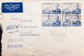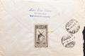 944(4). 1949. 1 pts azul ultramar, bloque de cuatro. Certificado de LAS ARENAS (VIZCAYA) a TURIN (ITALIA). Al dorso sello Benéfico de 10 cts utilizado como cierre y llegada. MAGNIFICA.