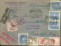 966(4), 916, 917(2), 923. 1944. 75 cts azul, cuatro sellos y diversos valores (uno con defecto de origen). Certificado de SOLLER (BALEARES) a FRANKFURT (ALEMANIA). Al dorso llegada. MAGNIFICA.