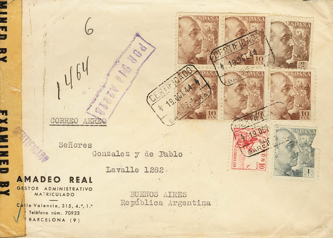 934(5), 931, 932, 917. 1944. 10 pts castaño, cinco sellos, 1 pts pizarra (defecto), 2 pts castaño y 10 cts rojo. Certificado de BARCELONA a BUENOS AIRES. Al dorso llegada. MAGNIFICA Y ESPECTACULAR FRANQUEO.