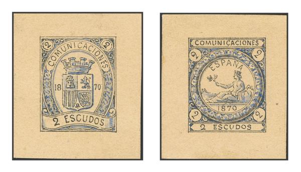(★)1870. Conjunto de dos pruebas de 2 escudos de PROYECTOS NO ADOPTADOS, efectuados con motivo de la emisión de "La Matrona". MAGNIFICOS Y EXTRAORDINARIAMENE RAROS, NO RESEÑADOS EN GALVEZ AUNQUE PROCEDAN DE SU COLECCION PARTICULAR.