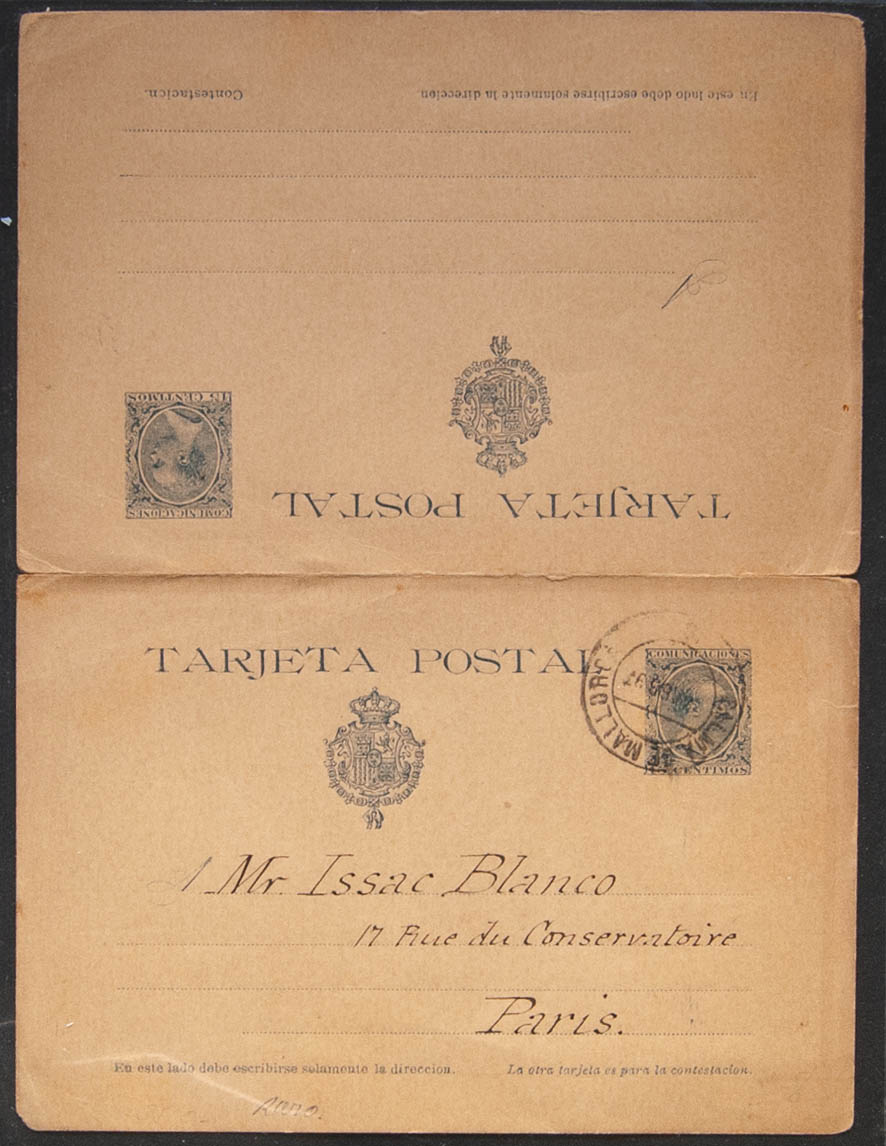 EP28. 1897. 15 cts + 15 cts azul sobre Tarjeta Entero Postal circulada sólamente la ida circulada de PALMA DE MALLORCA a PARIS, de ida y vuelta. MAGNIFICA.