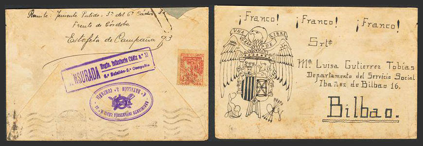 Guerra Civil. Bando Nacional. Franquicia al dorso REGIMIENTO INFANTERIA CADIZ Nº33 / 6º BATALLON 3ª COMPAÑIA, llegada. MAGNIFICA.