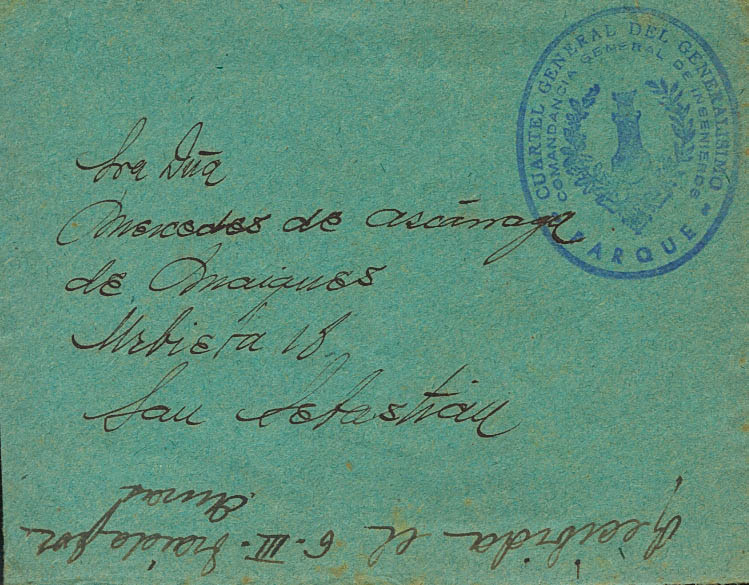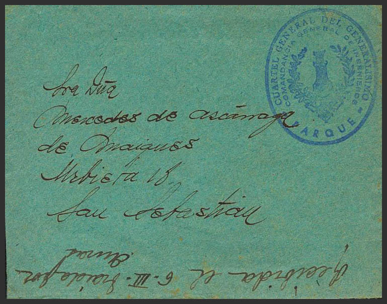 Guerra Civil. Bando Nacional. CUARTEL GENERAL DEL GENERALISIMO / COMANDANCIA GENERAL DE INGENIEROS, al dorso llegada. MAGNIFICA.