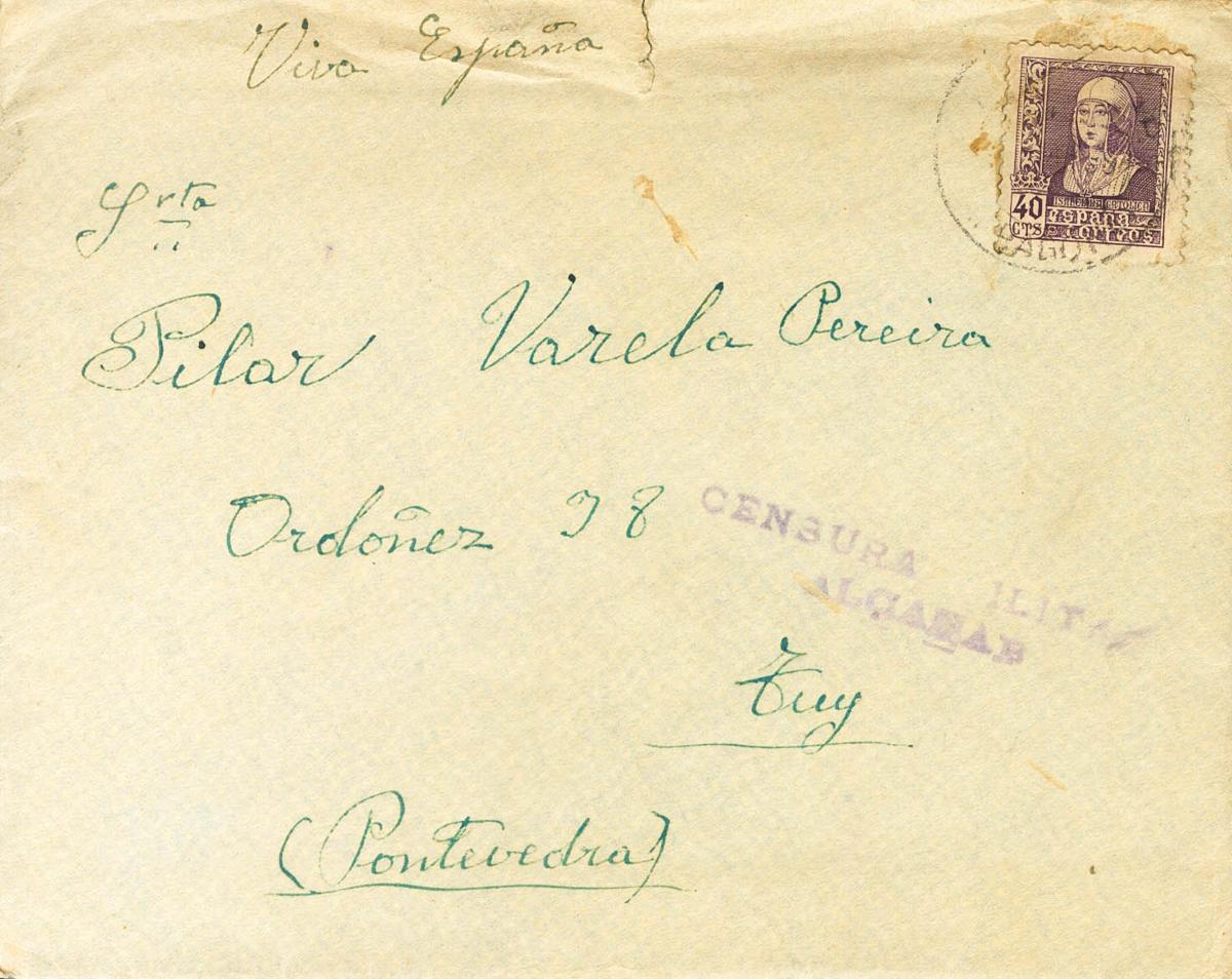1938. 40 cts violeta. ALCANAR (TARRAGONA) a TUY (PONTEVEDRA). En el frente marca CENSURA MILITAR / ALCANAR, en violeta. MAGNIFICA Y MUY RARA.