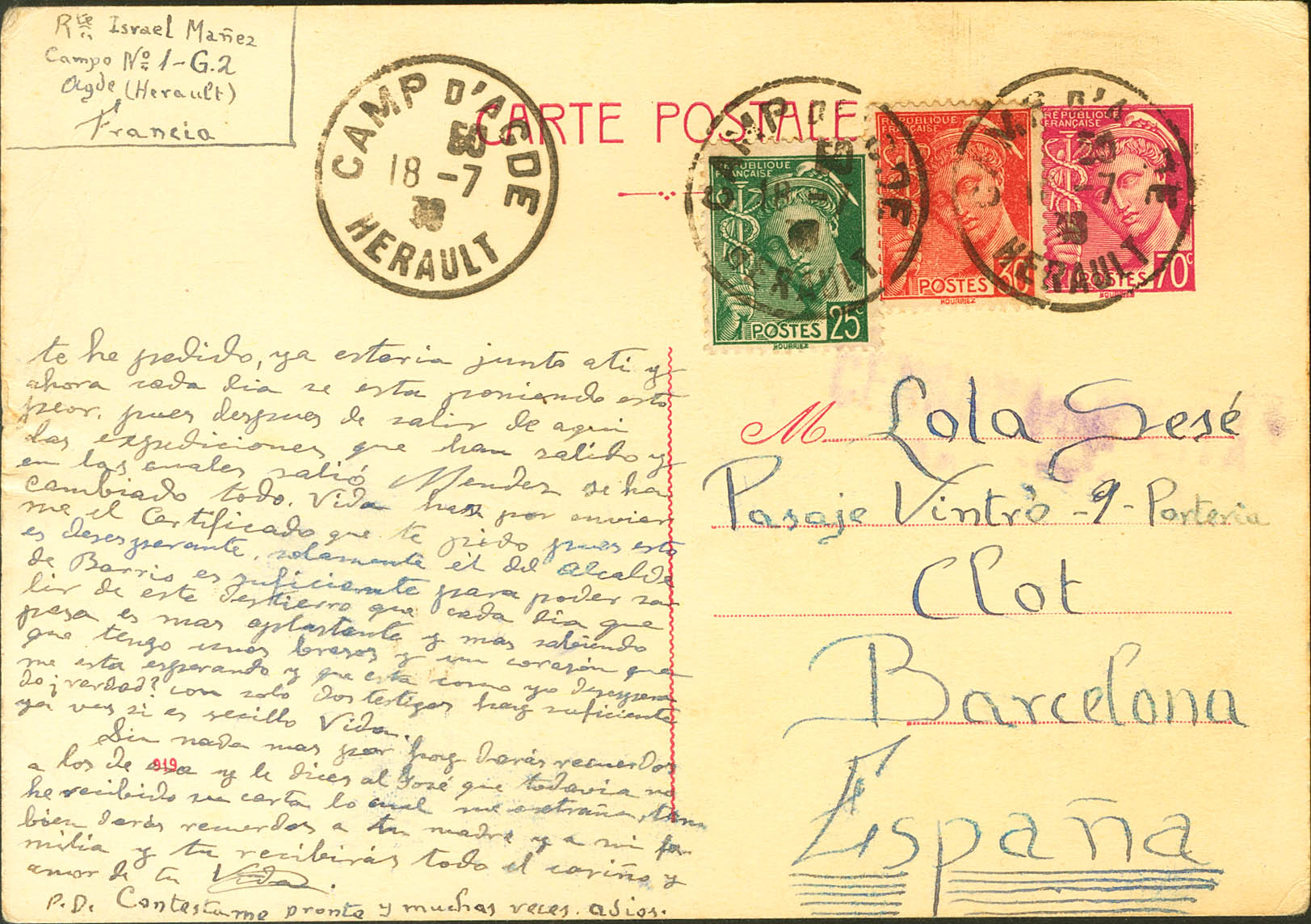 1939. 70 cts rosa lila sobre Tarjeta Entero Postal francesa de AGDE a BARCELONA, con franqueo complementario de 25 cts verde y 30 cts rojo, remitida por un español internado en el Campo de Concentración de Agde. Matasello CAMP DE AGDE / HERAULT. MAGNIFICA Y RARO USO DE TARJETAS ENTERO POSTALES EN UN CAMPO DE REFUGIADOS ESPAÑOLES.