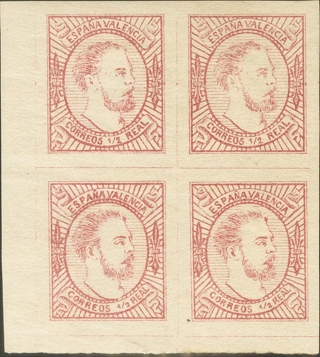 ★★/★ 159(2), 159A(2). 1874. ½ real rose, block of four, sheet corner (Types I and II). LUXURY PIECE.