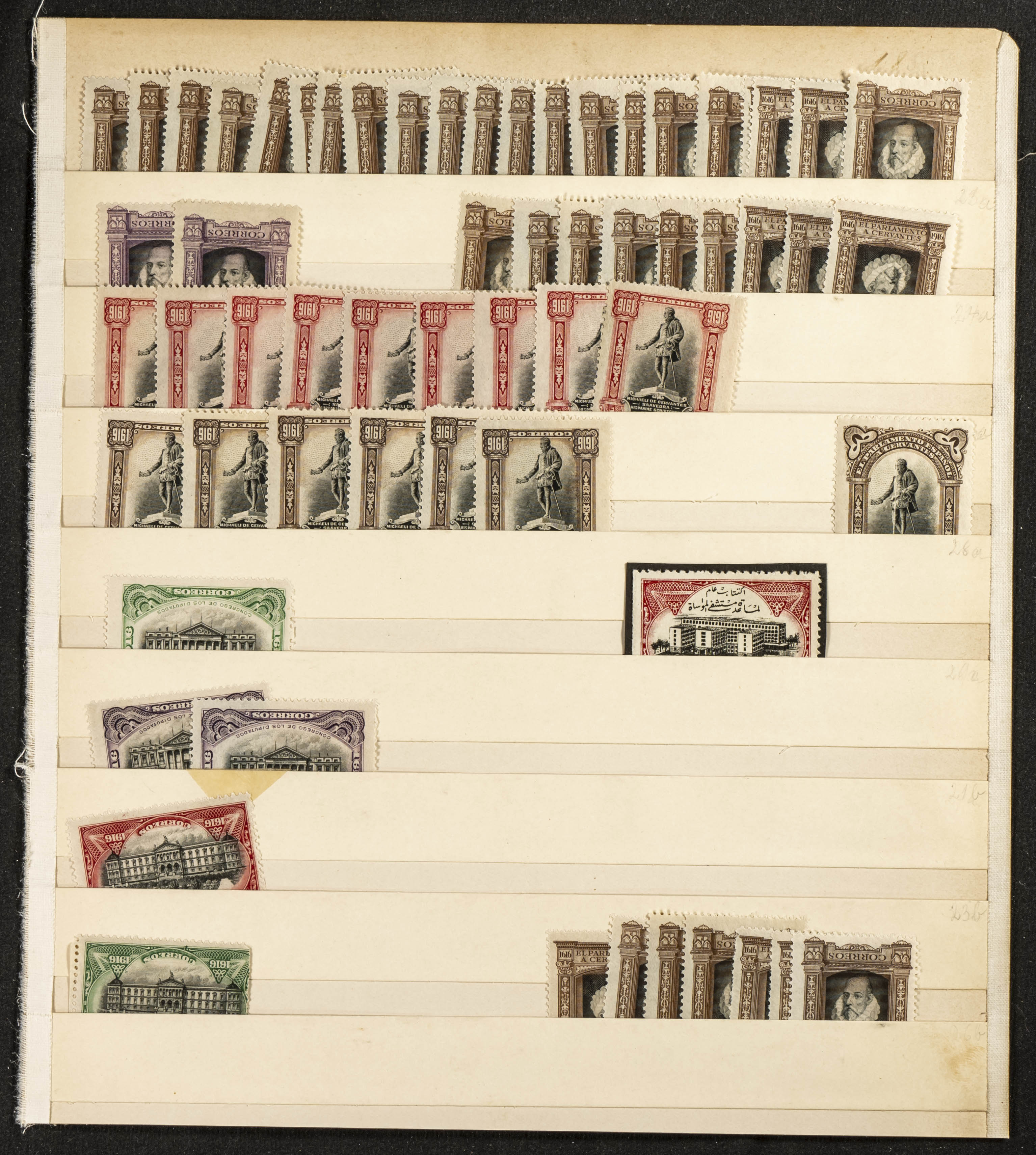 ★★/★1916. Interesante conjunto de más de cincuenta y cinco sellos sueltos, en nuevo y con centro invertido de la emisión de Franquicia de Cervantes de 1916, incluye un sello de Beneficencia de Líbano cuyo marco se realizó como dos valores de esta serie. ALTO VALOR DE CATALOGO. A EXAMINAR.