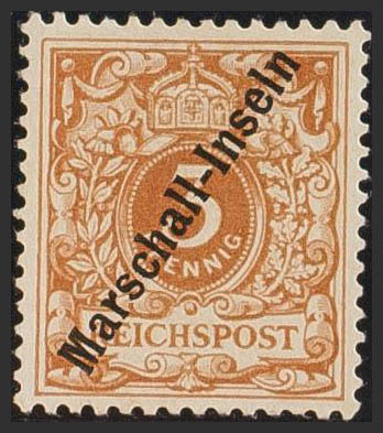 (★)Yvert 1. 1897. 3 p yellow bistre (Issue of Jaluit). MAGNIFICENT AND RARE. Certificate TH. C. BAKKER. (Mi1Ia 4,500 Euros)
