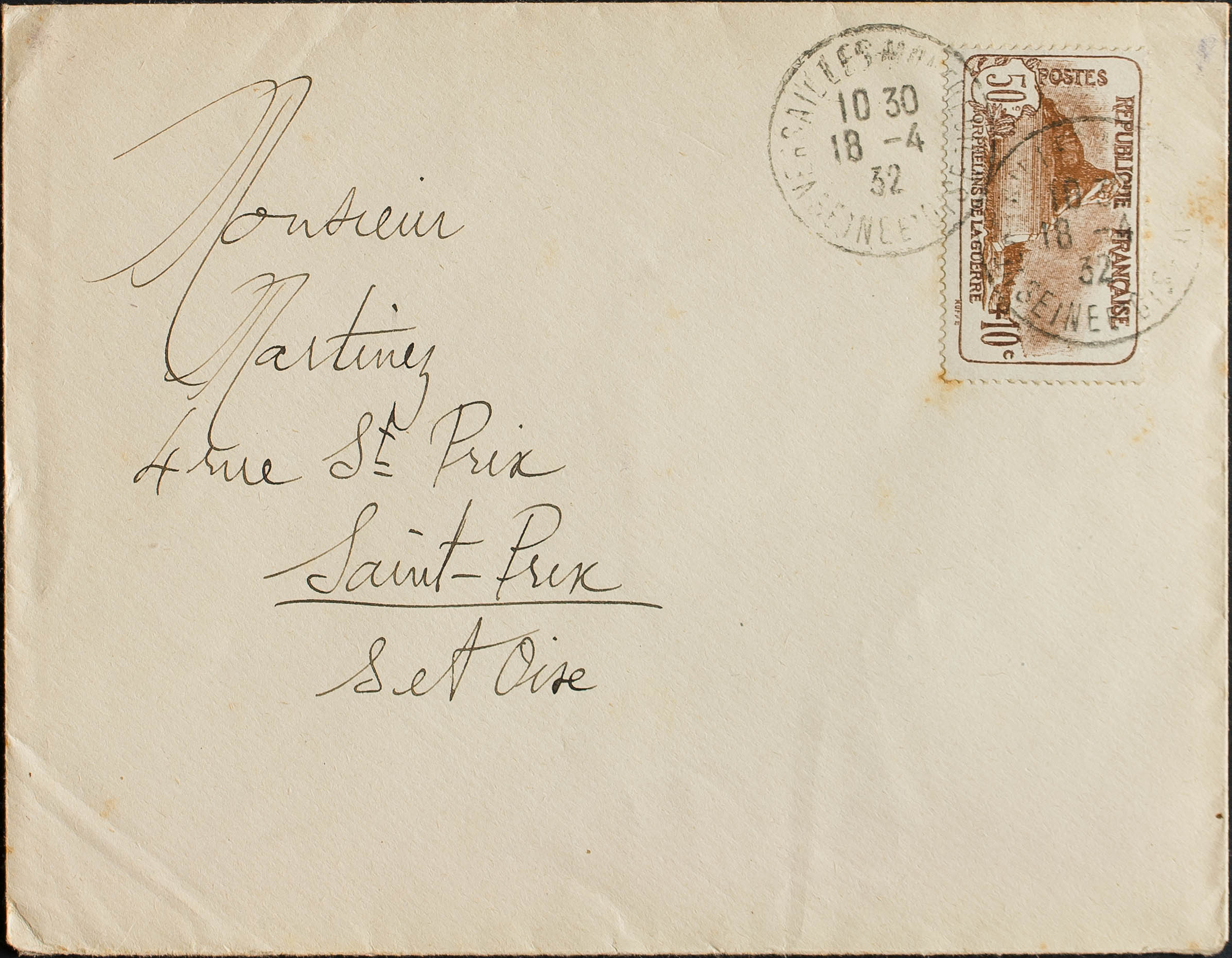 English Yvert 230. 1932. 50 cts + 10 cts (slightly toned). VERSAILLES to SAINT PRIX. On the back arrival. PRETTY.