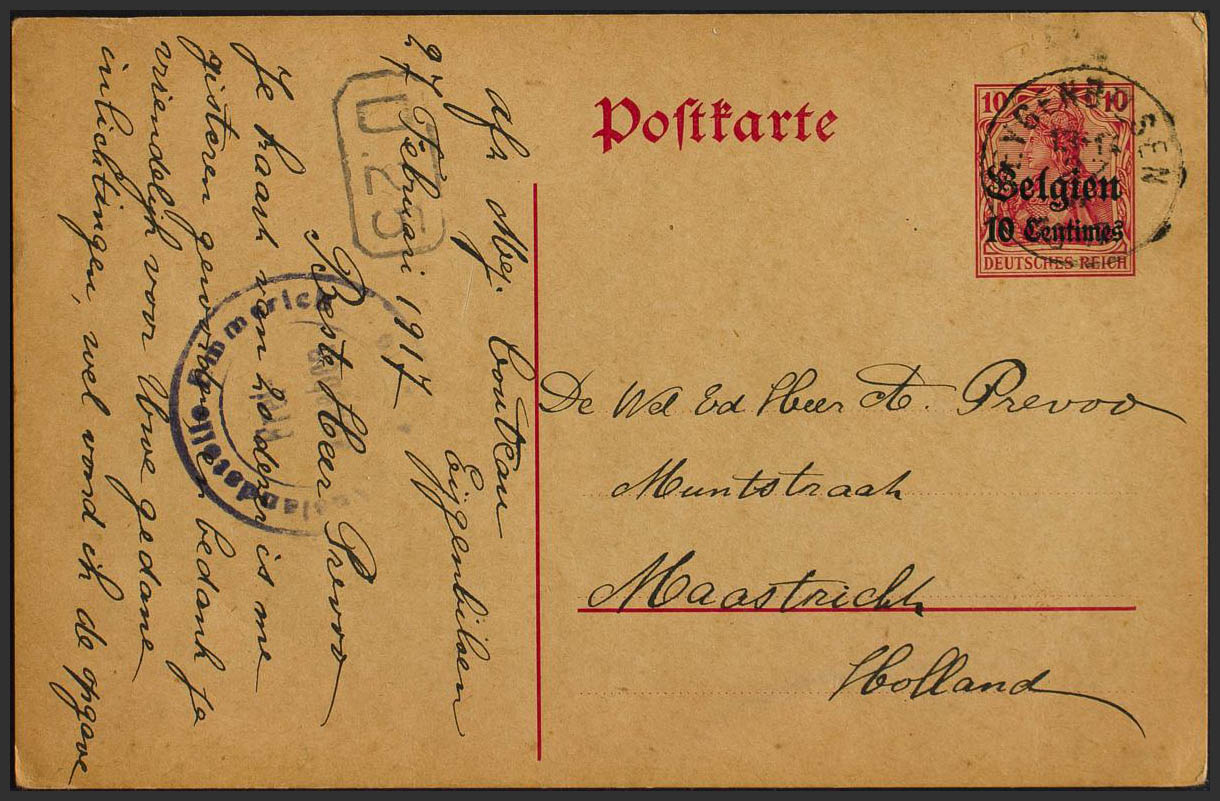 1917. 10 cts on 10 p red on Entire Post Card from EIGENBILSEN to MAASTRICH (HOLLAND). On the front censor mark. MAGNIFICENT.