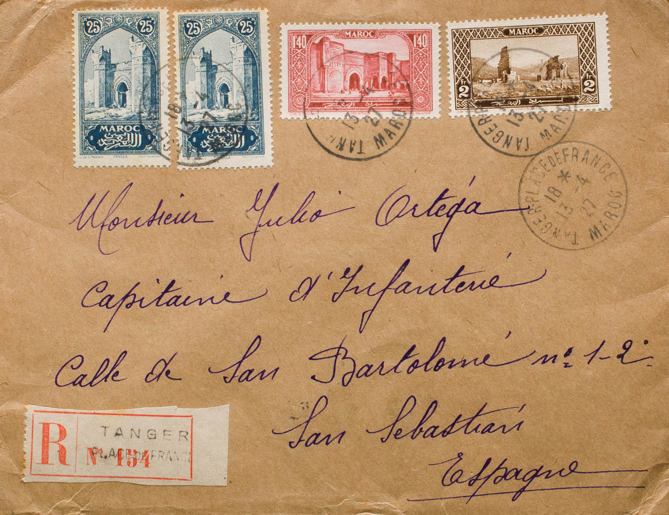 Yvert 106(2), 118, 120. 1927. 25 cts blue, two stamps, 1´40 f carmine pink and 2 f sepia. Certificate from TANGER to SAN SEBASTIAN. On the back transit through Madrid. MAGNIFICENT.