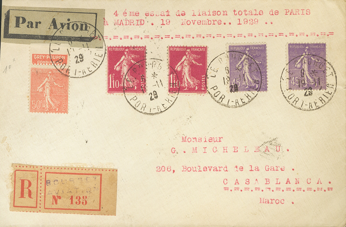 Yvert 238(2), 197(2), 199. 1929. 1´10 f pink carmine, two stamps, 45 cts lilac and 50 cts orange. Certificate from LE BOURGET to CASABLANCA (MOROCCO). On the front there is the text "4 days of departure from PARIS to MADRID. 19 November 1929" and arrival on the back. MAGNIFICENT AND RARE, ONLY FORTY LETTERS WERE CARRIED ON THIS FLIGHT.
