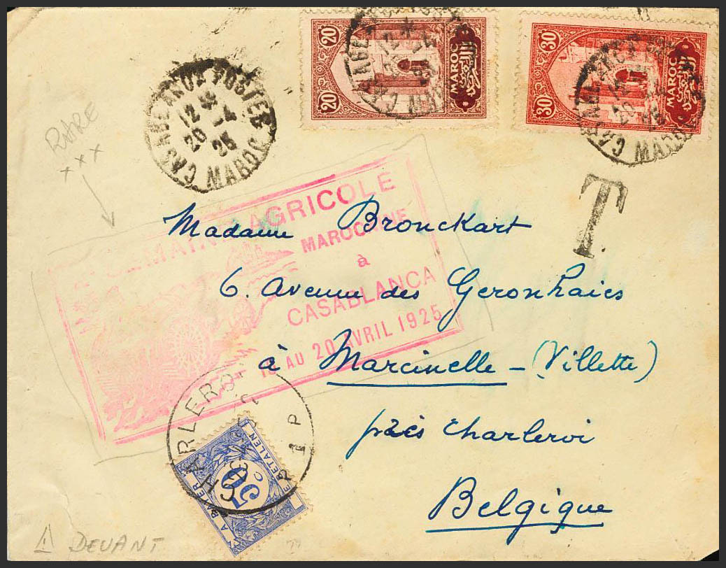 English Yvert 105, 107. 1925. 20 cts lilac and 30 cts red. Front from CASABLANCA to MARCINELLE (BELGIUM). On the front brand SEMAINE AGRICOLE / MAROCAINE / A CASABLANCA, in carmine and appraised on arrival in Belgium with a 50 cts Tax stamp. MAGNIFICENT AND RARE.