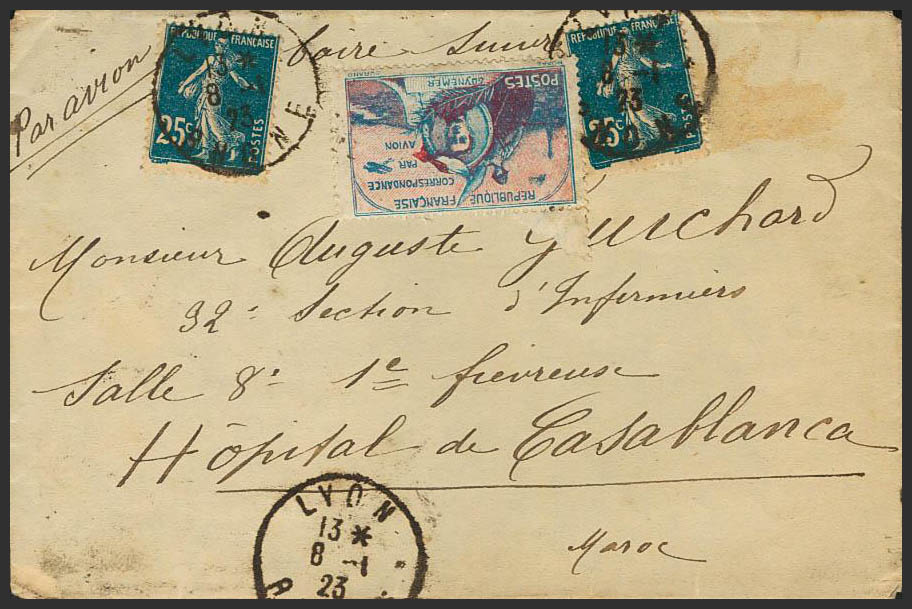 English Yvert 140(2). 1923. 25 cts blue and Guynemer precursor vignette. LYON to CASABLANCA (MOROCCO). On the back arrival. MAGNIFICENT.