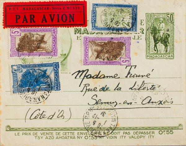 Yvert 51, 67, 73. 1920. 1 fr on 1 fr burgundy red, 10 cts red and 40 cts ultramarine. CASABLANCA to BREST (FRANCE). On the back it marks 23º BATAILLON DE TIRAILLEROS SENEGALAIS / LE CHEF / DE BATAILLON / COMMANDANT, in purple and arrival on the back. MAGNIFICENT.