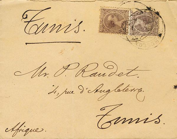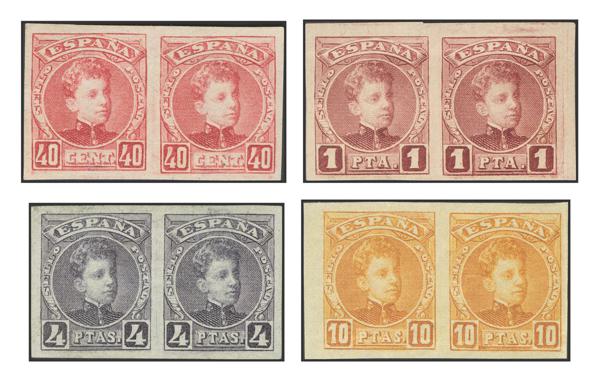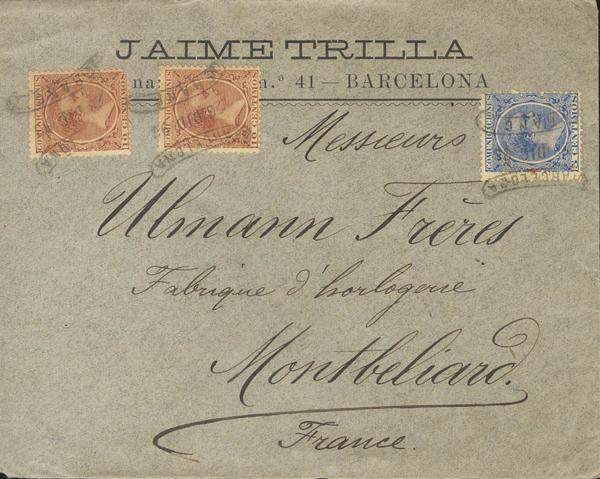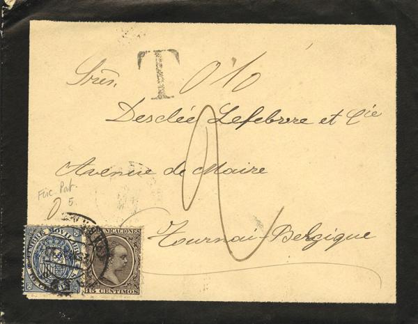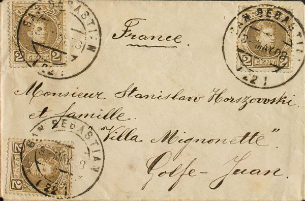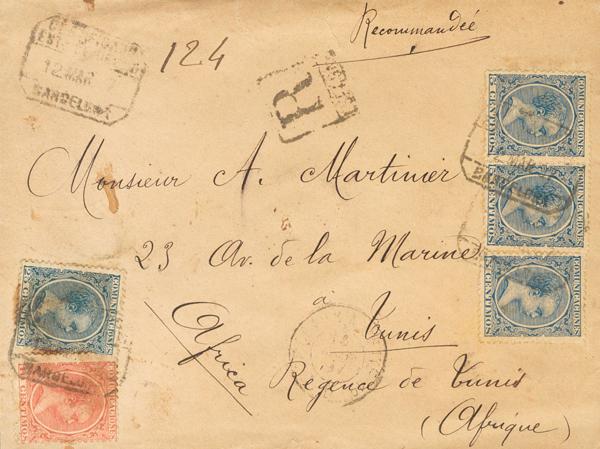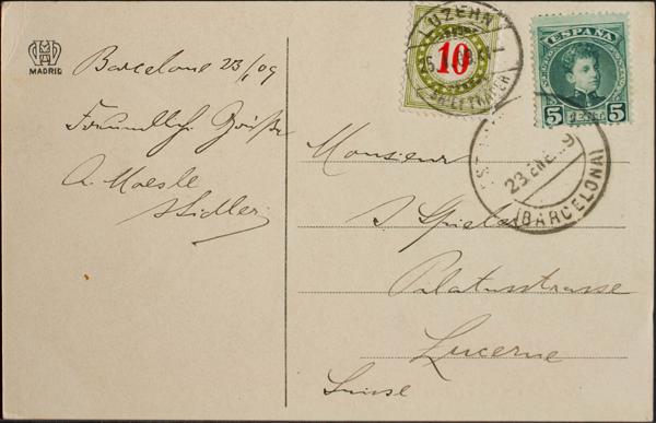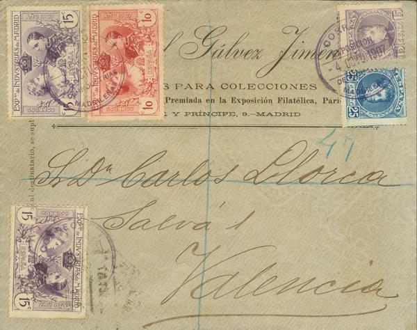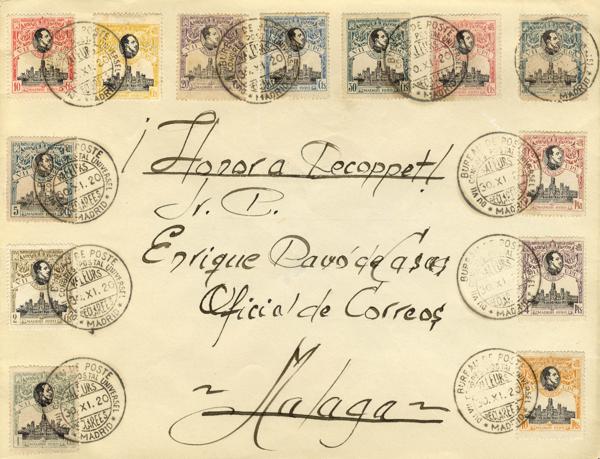 292(3), 293, 294hi, Mar 83(4). 1924. 5 cts three stamps, 10 cts, 50 cts, 25 cts REVERSED OVERLOAD, 10 cts block of four from Morocco. LARACHE to MADRID. MAGNIFICENT AND VERY RARE NO MORE THAN TWO OR THREE LETTERS KNOWN WITH THIS VARIETY.