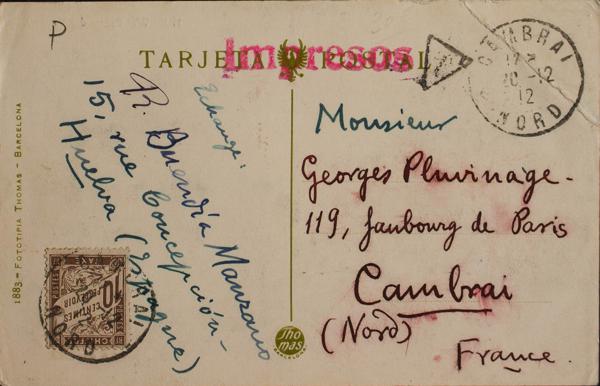 317. 1926. 25 cts carmine. Postcard from Gran Canaria of the FRANCE-MADAGASCAR air raid, in the LAS PALMAS-PORT ETIENNE stage. Flight mark VOYAGE AERIEN / FRANCE-MADAGASCAR, in purple and linear NOTICE "LA SUIPPE" / COMMANDE PAR M VASSAL, CAPITAINE DE CORVETTE, in blue, of the ship that supported the Raid aircraft. MAGNIFICENT AND EXTREMELY RARE, NO MORE THAN TWO OR THREE CARDS KNOWN WITH THE MARK OF THE SHIP "LA SUIPPE".