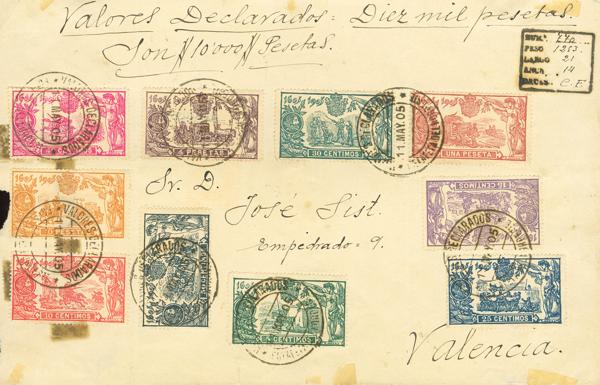 |ENVELOPE| 313(8), 292(2). 1925. 10 cts carmine, eight stamps and 5 cts green. Certificate from MADRID to BERLIN (GERMANY). Arrival on the back. MAGNIFICENT.