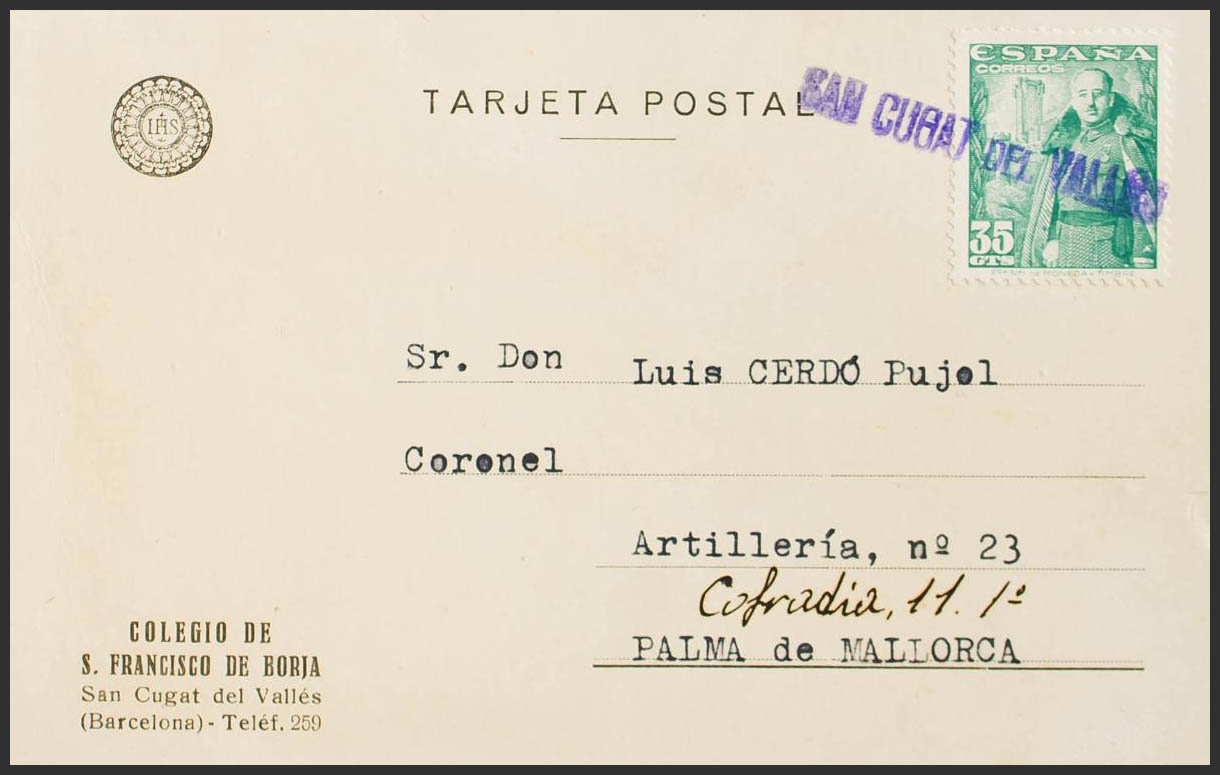1026. 1950. 35 cts green. SAN CUGAT DEL VALLES to PALMA DE MALLORCA. Linear postmark SAN CUGAT DEL VALLES, in violet. MAGNIFICENT AND RARE.