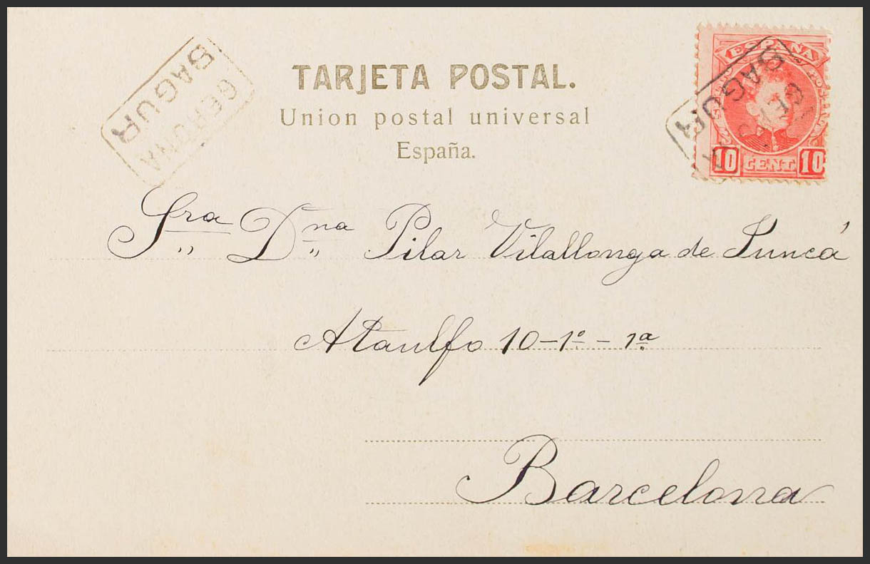 243. 1905. 10 cts red. Postcard from BAGUR (GERONA) to BARCELONA. Mail postmark BAGUR / GERONA. MAGNIFICENT.